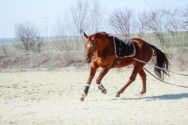 Wenn du und dein Pferd mit der Doppellonge im Schritt vertraut sind, kannst du dich an den Trab und den Galopp heranwagen. Die Handhaltung bleibt gleich. Auch an der „Zügelführung“ veränderst du nichts. Du musst lediglich schneller reagieren und auch im höheren Tempo darauf achten, dass du die Leinen weder zu straff noch zu locker hältst. Letzteres kann für ein ständiges, unangenehmes Ruckeln im Pferdemaul sorgen.