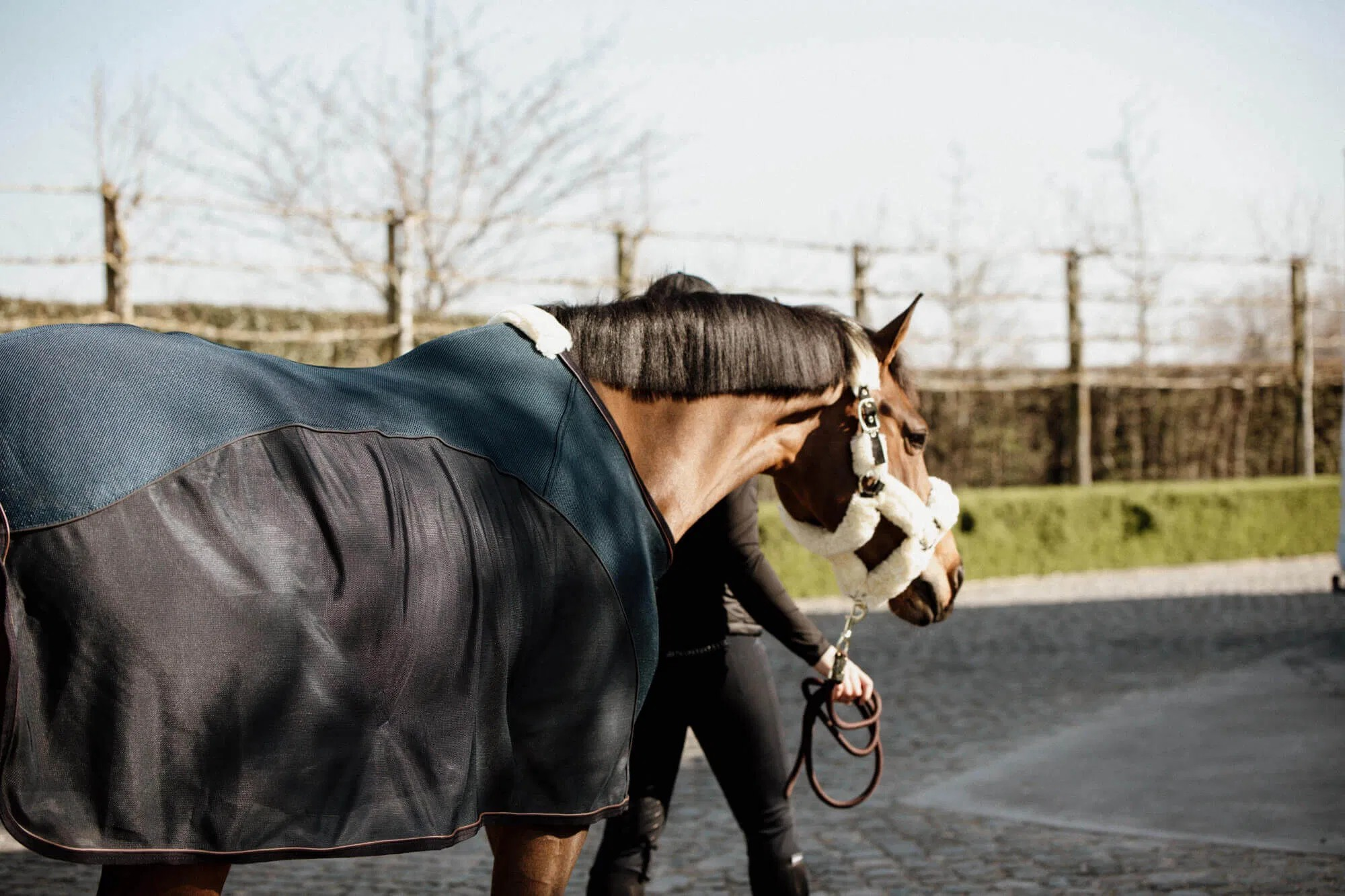 Die Mesh Abschwitzdecke von Kentucky Horsewear ist ein echtes Allround-Talent. Sie kombiniert gleich mehrere Anwendungsmöglichkeiten in einem. So kann sie dank des leichten und atmungsaktiven Materials ideal zum Trocknen nach dem Reiten oder Duschen Ihres Pferdes verwendet werden. Außerdem kombiniert diese Decke die Eigenschaften einer Fliegendecke mit dem 3D-Spacer-System. Auf der Innenseite besteht die Decke aus dem 3D-Spacer, einer leichten, aber starken Wabenstruktur, welche Schweiß absorbiert und Ihr Pferd trocken hält. Der untere Teil der Decke besteht aus Mesh-Material, welches Fliegen fernhält und zusätzlich die Luftzirkulation unterstützt. So kann Ihr Pferd langsam herunterkühlen. An der Decke sind abnehmbare Gurte angebracht, so dass die Decke bei Bedarf in eine Turnierdecke umgewandelt werden kann. Für eine ideale Passform ist die Decke anatomisch geformt und an der Schulterpartie flach gefüttert. Für zusätzlichen Tragekomfort ist am Widerrist ein künstliches Schaffell angebracht. Außerdem wurde das Material speziell so entwickelt, dass keine Haare daran hängen bleiben. Die braunen Paspeln und das Kentucky-Logo aus Kunstleder runden den edlen Look dieser tollen Decke ab.