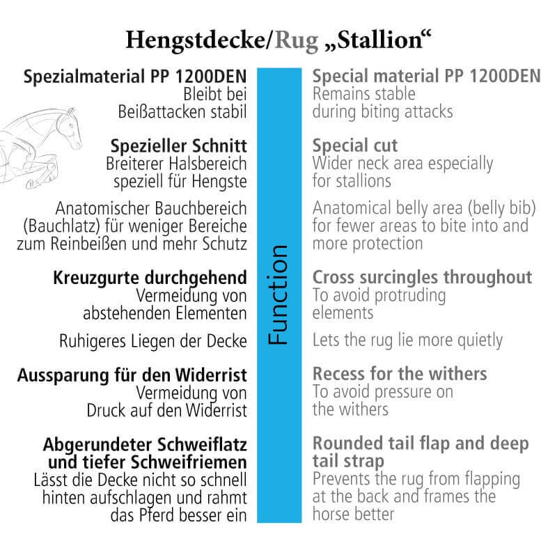 - die Decke verfügt über einen breiteren Halsausschnitt, der gezielt auf den Körperbau von Hengsten und kräftigen Pferden abgestimmt ist