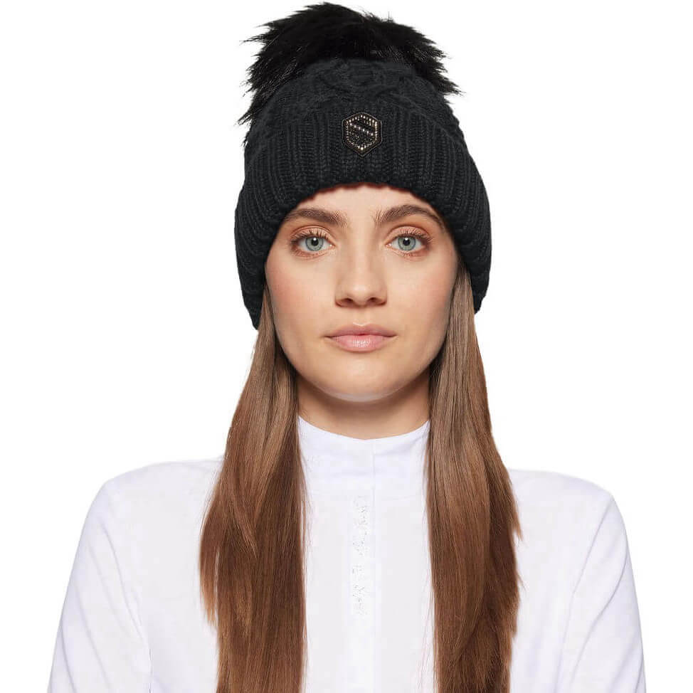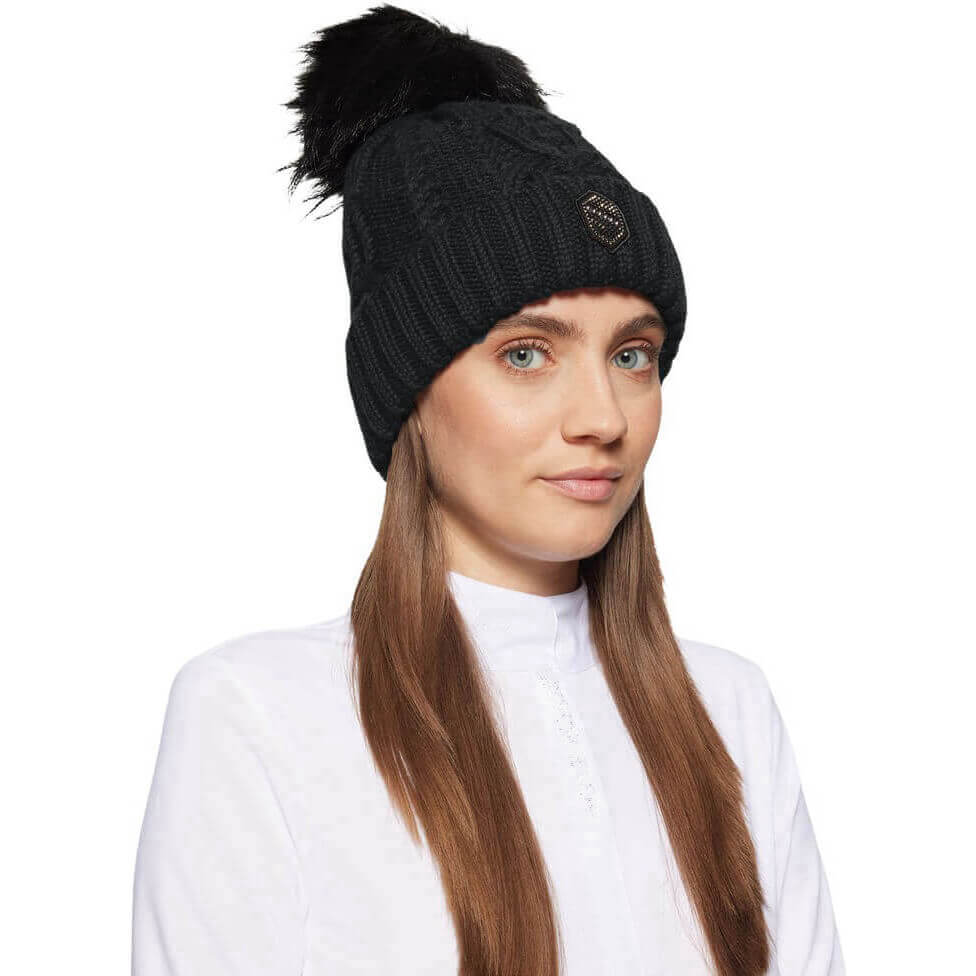 - edles Zopfstickmuster mit Kunstfellbommel