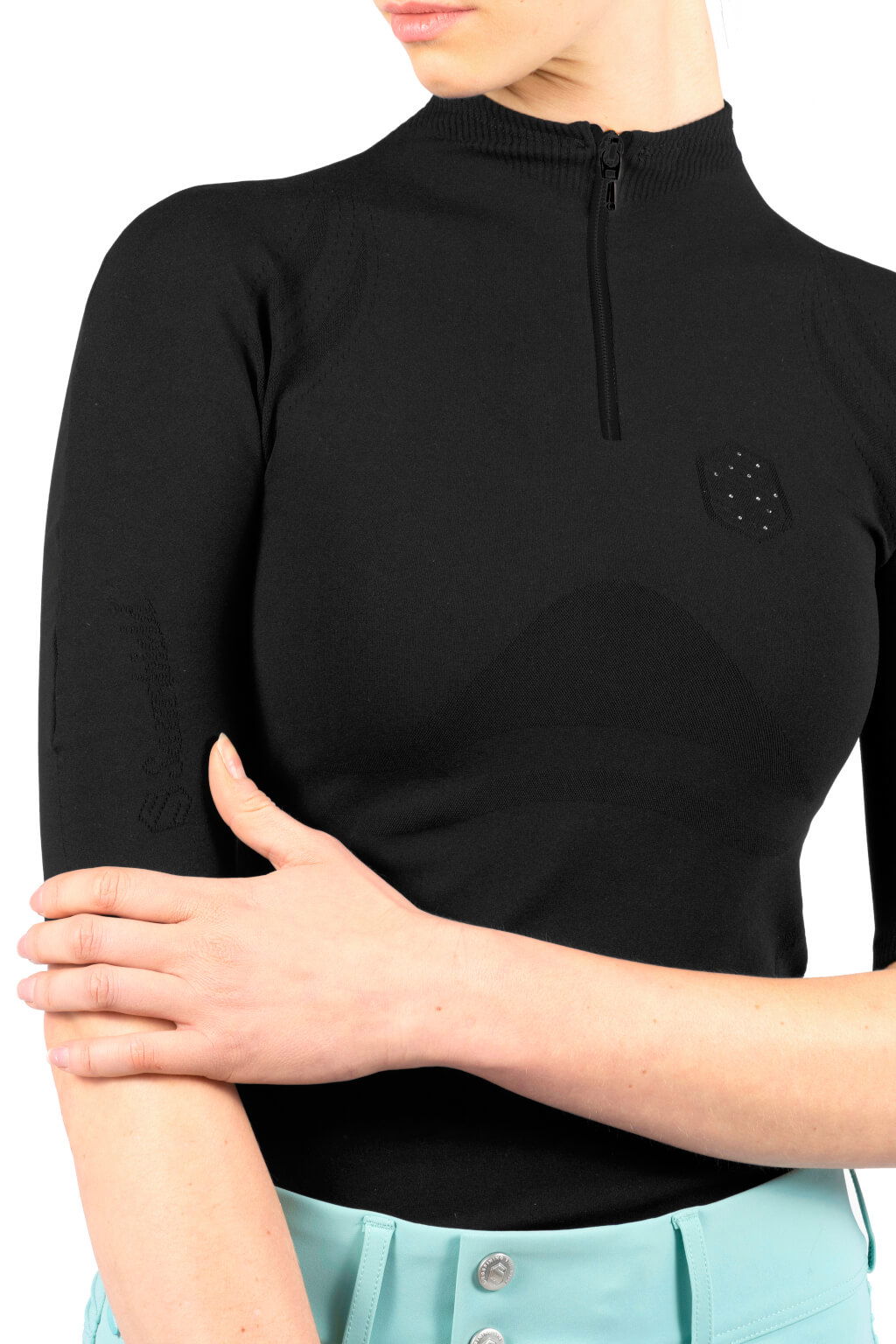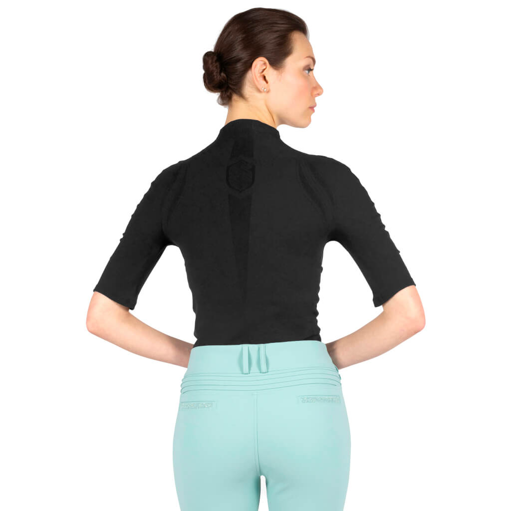 Das T-Shirt Alice von Samshield aus der Frühjahr/Sommer Kollektion 2022 überzeugt durch zahlreiche funktionelle Eigenschaften. Es besteht aus einem Nylon-Roca-Gemisch und ist schnelltrocknend und durch perforierte Einsätze besonders atmungsaktiv. Zudem ist das Material knitterfrei und daher einfach zu pflegen. Eine Besonderheit dieses T-Shirts ist die nahtlose Verarbeitung, die die Entstehung von Reibung und Druckstellen verhindert und so für einen hohen Tragekomfort sorgt. Dieser wird durch einen gerippten Kragen unterstützt. Ein einfaches und schnelles Öffnen und Schließen wird durch einen Reißverschluss an der Vorderseite ermöglicht. In Kombination mit Blazons an Rücken und Brust, einem Schriftzug am Ärmel und Verzierungen mit Swarovskisteinen ist dieses Shirt der ideale Begleiter für das tägliche Training und die Stallarbeit.