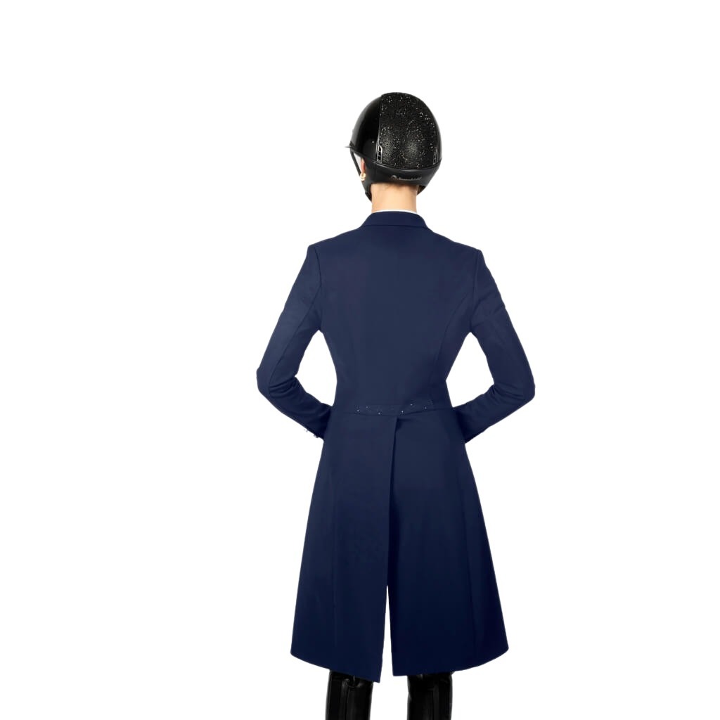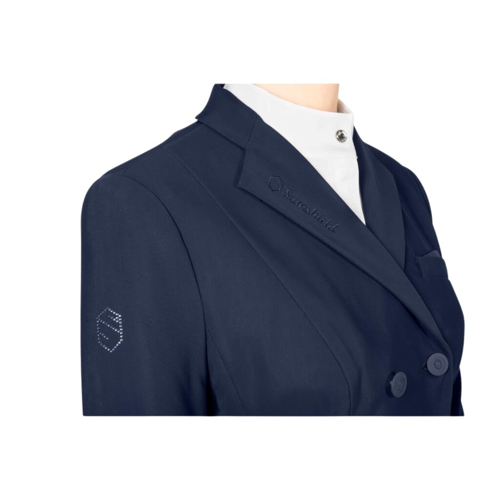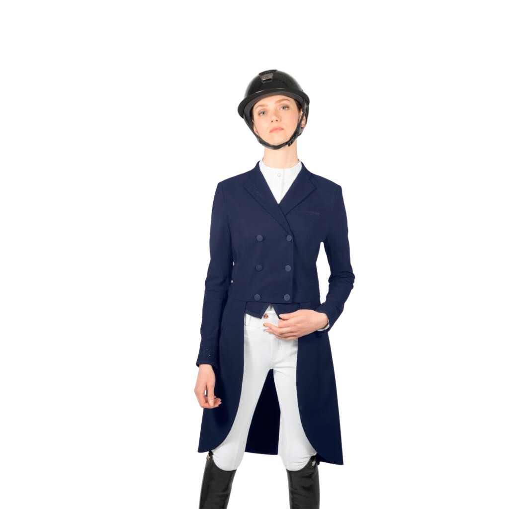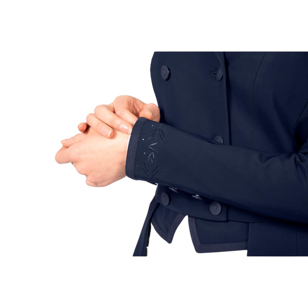 Der Frack Jully stammt aus der Frührjahr/Sommer Kollektion 2022 von Samshield. Durch seine spezielle Materialzusammensetzung von Polyamid und Elasthan ist es besonders atmungsaktiv und elastisch, daher schränkt er die Beweglichkeit beim Reiten nicht ein. Zudem verfügt der Frack über einen UV-Schutz und ist daher ideal für den Sommer geeignet. Ein echtes Highlight sind die Swarovski Crystals an den Ärmeln und am Rücken. Das Samshield Logo an der rechten Armoberseite ist ebenfalls aus Swarovski Crystals. Zudem besitzt der Frack dezente Bestickungen auf den Ärmeln, Rücken und am Kragen. Die Alcantara Einfassung an Schößen, Ärmeln und dem Einstecktuch runden den edlen Look ab. Durch seinen knitterfreien und abriebfesten Stoff ist dieser Frack besonders pflegeleicht und langlebig.