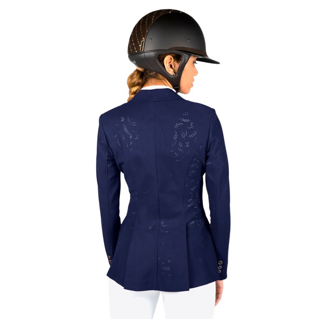 Dieses luftige Turniersakko Alix Air für Damen kommt aus dem Hause Samshield und stammt aus der Frühjahr/Sommer Kollektion 2022. Durch seine Eigenschaften ist es bestens für den Hochsommer geeignet. Das Stoffgemisch aus Polyamid und Elasthan ist hoch elastisch und durch die Reitschlitze am Rücken bietet es den höchstmöglichen Bewegungsfreiraum. Auf der Vorderseite wird es durch 3 Knöpfe geschlossen, an jedem Ärmelabschluss befinden sich auch 3 Knöpfe. Die 2 Fronttaschen bieten viel Platz und können mit einem Reißverschluss sicher verschlossen werden. Das besondere an diesem Jacket ist der perforierte Stoff, der sich an den Seiten, über den ganzen Rücken und an den Ärmeln befindet. Die Perforation macht das Sakko besonders atmungsaktiv und angenehm im Sommer zu Tragen, da die Luft zirkulieren kann, aber es trotzdem noch vor schädlichen UV-Strahlen schützt.